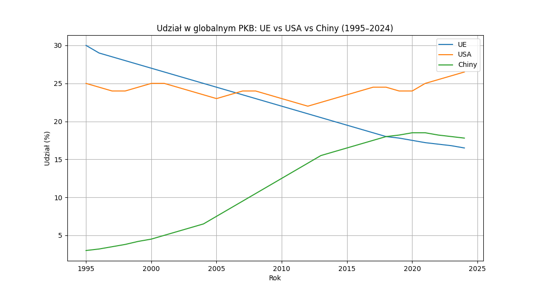 We francuskim (całkiem niezłym) filmie „Nienawiść” kilka razy powtarzany był motyw faceta, który spadał z dużej wysokości i w locie powtarzał sobie „na razie nie jest źle, na razie nie jest źle” i mniej więcej tak wygląda dzisiejsza sytuacja Unii Europejskiej, której zamożność bazuje na wyprzedaży dóbr, wypracowanych przez poprzednie pokolenia. Nawet wielki eurokrata, Radek Sikorski stwierdził w 2024 roku: „W 1992 r. udział UE w globalnym PKB wynosił 29%; dziś jest to 17%„. Mówił to w kontekście przejmowania prezydentury unijnej przez Polskę, że niby miałaby ona to odwrócić (spoiler: nie udało się). Szacunki najnowsze mówią nawet o 14,7% na rok 2026.