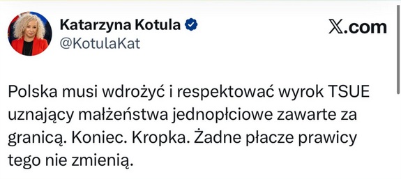 24-go listopada 2025 TSUE orzekł, że Polska musi respektować „małżeństwa” i związki jednopłciowe, które zostały zawarte w innych krajach UE (nawet, gdy zawieranie takich związków w Polsce jest nielegalne lub nieuregulowane prawnie). Co ciekawe- legalizacja takich związków była jedną ze sztandarowych obietnic Lewicy i całej koalicji rządowej, ale tego nie zrobili, a różne Lemparty po jesieni 2023 specjalnie na to nie naciskały, udowadniając mimowolnie, że wszystkie te „strajki” były tylko po to, aby osadzić Tusków u władzy, a hasła ze sztandarów były tylko pretekstem dla naiwnych. „Lewicowo-prawicowy” premier Tusk odniósł się do sytuacji w swoim stylu, łącząc powiedzonka: „jestem za, a nawet przeciw” oraz „jak przez minutę coś mówić i nic nie powiedzieć”.